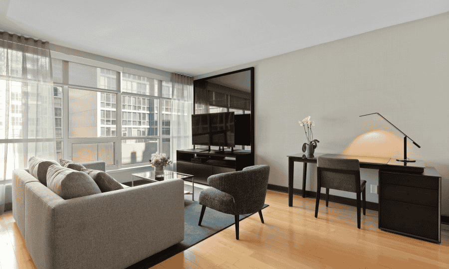 The suite is generously sized to accommodate families of various sizes, featuring interconnected spaces that provide privacy and connection. The main area includes a cozy seating space with comfortable sofas, perfect for family bonding over movies or games. A dining nook allows for intimate meals, while the room’s modern décor ensures a warm and welcoming ambiance.