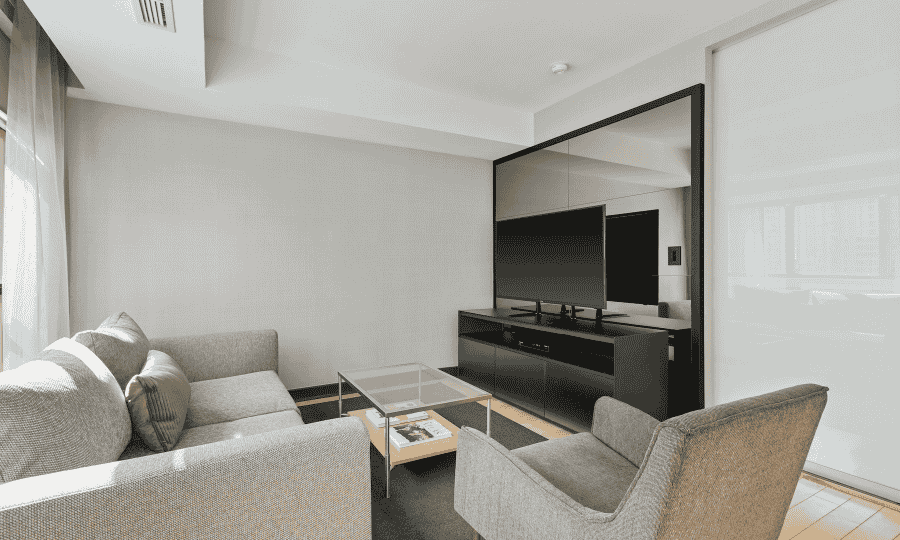 The suite is generously sized to accommodate families of various sizes, featuring interconnected spaces that provide privacy and connection. The main area includes a cozy seating space with comfortable sofas, perfect for family bonding over movies or games. A dining nook allows for intimate meals, while the room’s modern décor ensures a warm and welcoming ambiance.